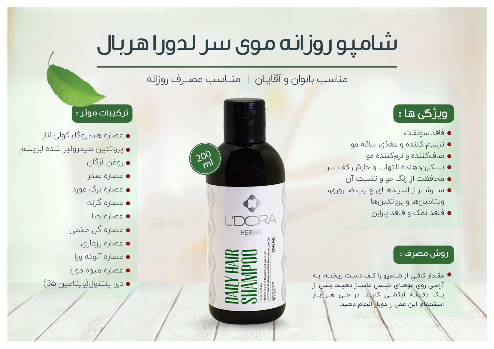 شامپو روزانه بدون سولفات لدورا هربال، یک محصول حرفهای است که مناسب انواع مو به ویژه موهای خشک و آسیبدیده است. این شامپو با ایجاد کف ملایم، چربی طبیعی پوست کف سر را حفظ کرده و به دلیل سورفکتانتهای ملایمی که دارد، مانع حساسیت و خشکی مو میشود. شامپو بدون سولفات لدورا هربال با حفظ رطوبت طبیعی مو به درخشش و نرمی آن کمک میکند. تثبیت و ماندگاری رنگ مو یکی دیگر از ویژگیهای این شامپو به شمار میرود.