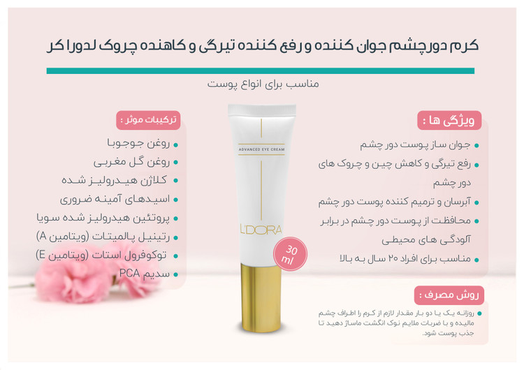 ویژگی ها :: جوانساز پوست دور چشم، رفع تیرگی و کاهش چین و چروکهای دور چشم، آبرسان و ترمیمکننده پوست دور چشم، محافظت از پوست دور چشم در برابر آلودگیهای محیطی