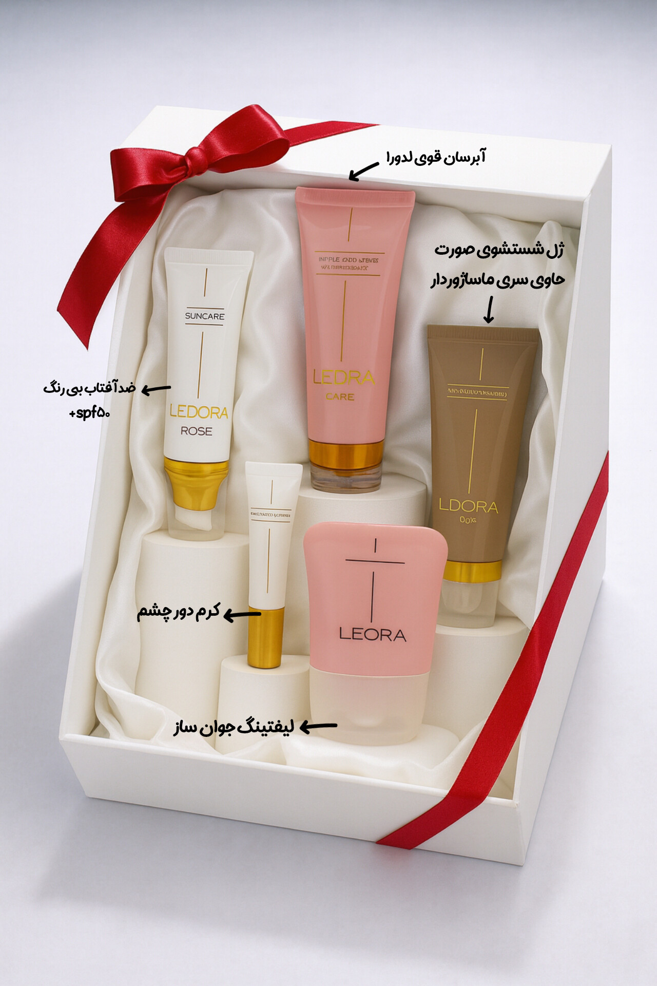 پک مراقبت تخصصی پوست لدورا، روتین کامل پوست، آبرسان قوی، کرم لیفتینگ، ضدآفتاب SPF50، کرم دور چشم، ژل شستشو، پک تخفیفی، جوانسازی پوست.